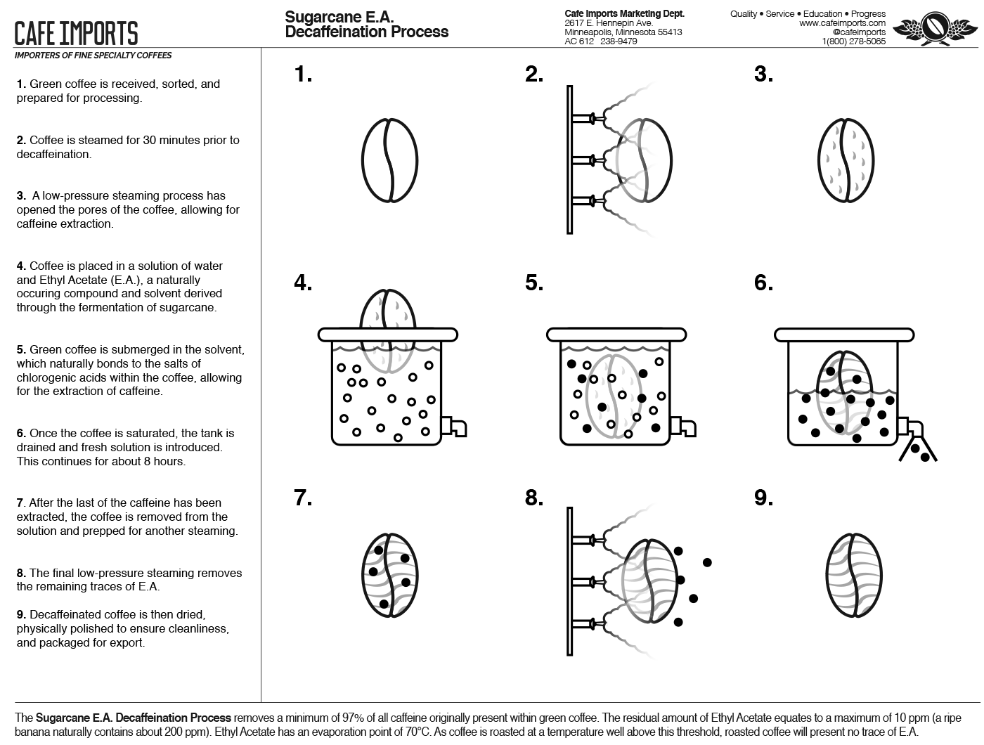 The green beans are put into a steam chamber where the silver skin is removed from the bean, before immersing them in spring water. When the coffee is saturated with water it is sent to the extractors where the beans have direct contact with sugar cane ethyl acetate for 8 hours which dissolves the caffeine content.